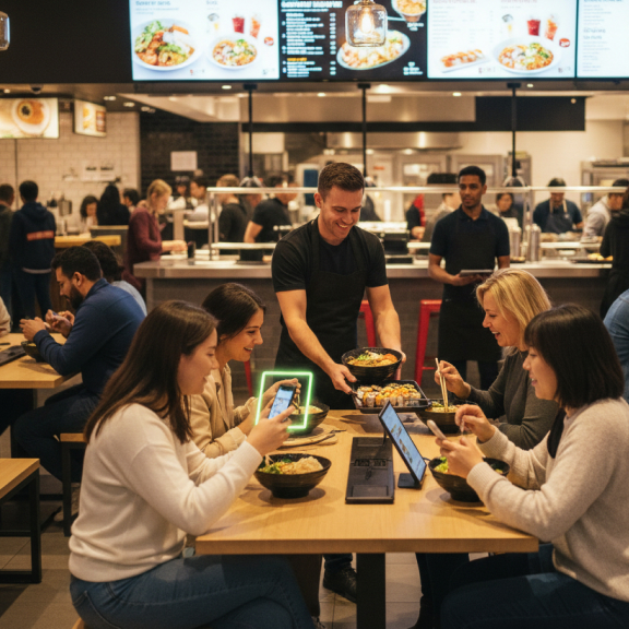 At food courts and quick-service spots, customers can order from their phones, customize meals, and get them served right at their table — instantly.
